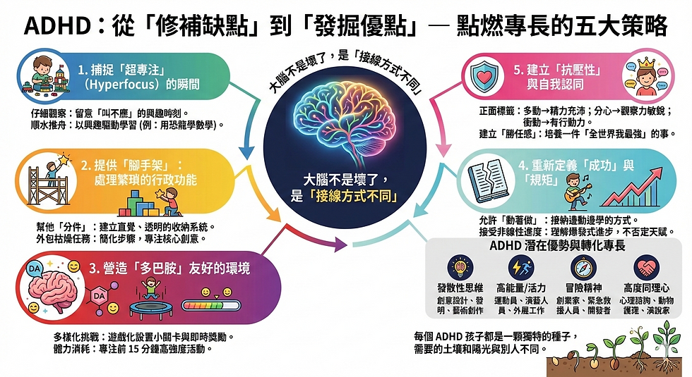 陪伴 ADHD(注意力不足/過度活躍症)的小朋友成長,最重要的一步是將視角從「修補缺點」轉向「發掘優點」。ADHD 的大腦並不是「壞了」,而是「接線方式不同」。